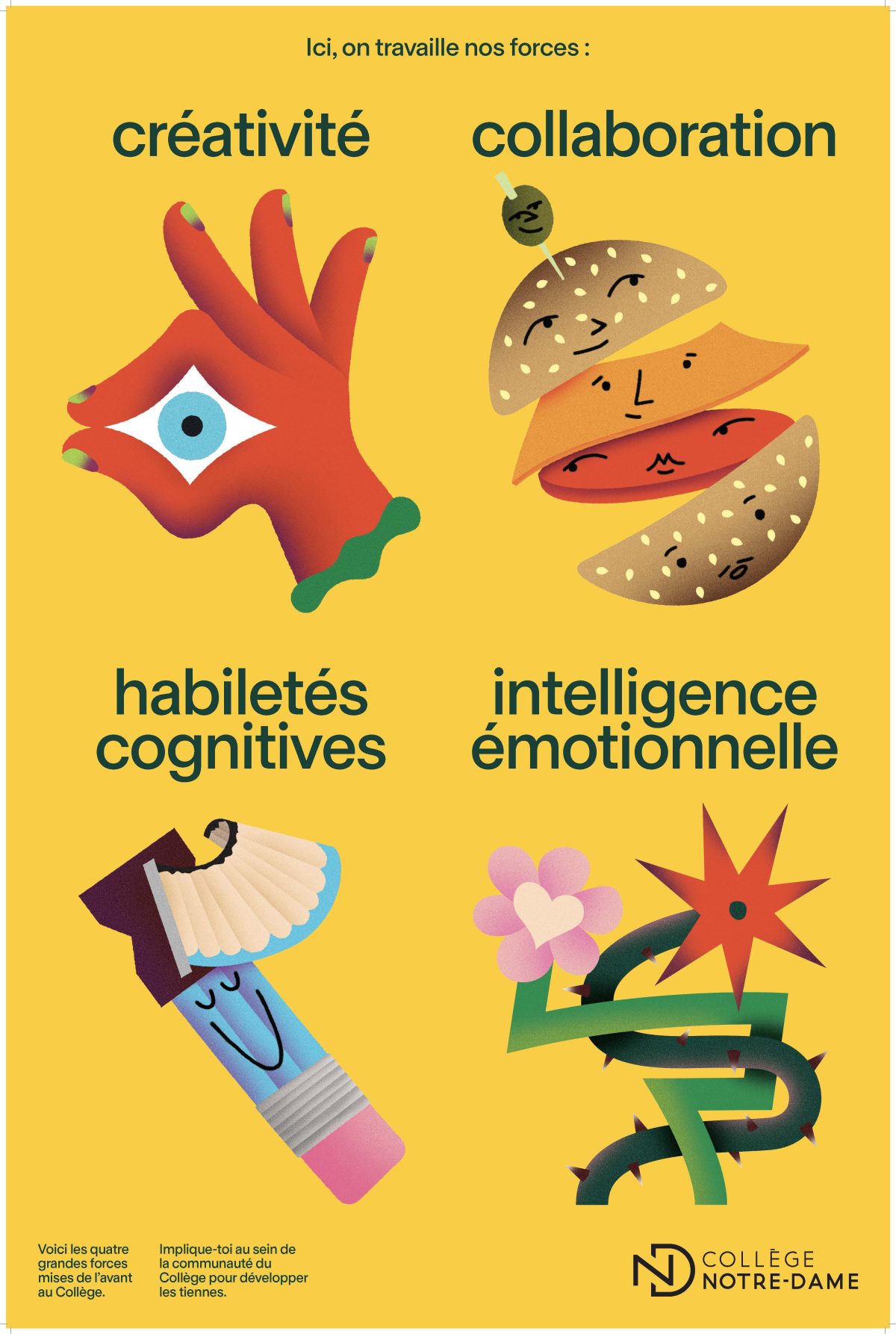 Le profil de sortie trace le portrait du jeune que nous accompagnons pendant cinq ans et que nous voyons grandir, évoluer et s’affirmer au fil de son parcours au Collège. Il représente l’ensemble des forces, des compétences et des attitudes que nous souhaitons voir émerger chez chaque élève au terme de ses études.